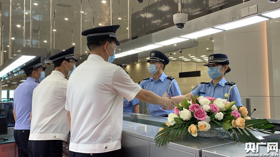 珠海邊檢總站、澳門治安警察局代表在珠澳分界線上互相敬禮、握手,開啟在橫琴口岸合作執(zhí)法執(zhí)勤的嶄新歷史(央廣網(wǎng)記者 陳越 攝)