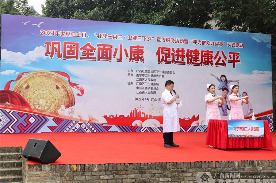 廣西新聞網(wǎng)南寧4月7日訊(記者 黎伊瑋)今年4月7日是第72個世界衛(wèi)生日,我國的宣傳主題為“鞏固全面小康,促進健康公平”。為了推動全區(qū)廣大人民群眾對衛(wèi)生健康的重視,不斷提高全區(qū)各族人民的健康水平,2021年世界衛(wèi)生日、“壯族三月三·衛(wèi)健三下鄉(xiāng)”宣傳服務(wù)活動暨“我為群眾辦實事”實踐活動在南寧市江西鎮(zhèn)揚美古鎮(zhèn)金馬街廣場舉行。此次活動由自治區(qū)衛(wèi)生健康委員會主辦,南寧市衛(wèi)生健康委員會、江南區(qū)人民政府承辦,江南區(qū)衛(wèi)生健康局、中共江西鎮(zhèn)委員會、江西鎮(zhèn)人民政府協(xié)辦。