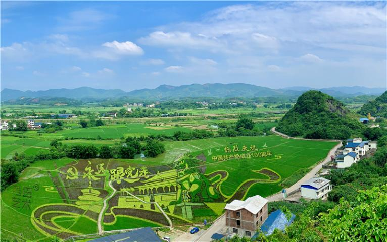 這是馬安村慶祝中國共產黨成立100周年的獻禮之作,以大地為畫布,用水稻為顏料,在以綠色為主基調的田野中,將褐、黃、綠不同顏色的水稻,拼湊成建黨100周年標識、北京天安門圖案、和平鴿等不同形態(tài)的圖案,勾勒出一幅唯美動人的“田園山水畫”,成為“美麗鄉(xiāng)村”的一道特色風景。