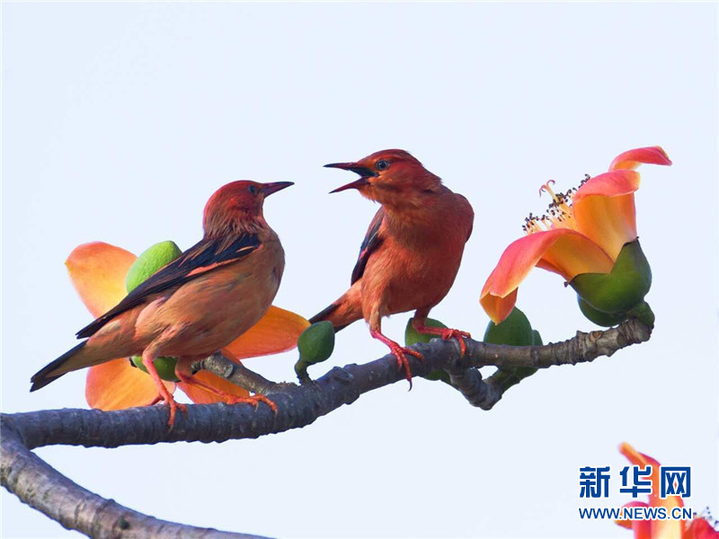 春歸大地,海口一小區(qū)一株木棉樹上來了兩只可愛的小鳥,配合紅碩木棉花吱喳逗趣。(新華網(wǎng)發(fā) 馬亮亮攝)