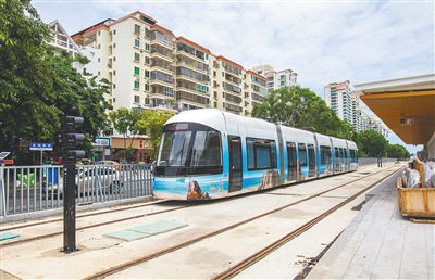 6月12日,有軌電車(chē)行駛在三亞市金雞嶺街路段。據(jù)悉,三亞有軌電車(chē)示范線項(xiàng)目全長(zhǎng)約8.37公里,連接三亞市中心和三亞火車(chē)站、三亞汽車(chē)站。目前解放路至育秀路全長(zhǎng)3.5公里的路段,聯(lián)調(diào)聯(lián)試已進(jìn)入尾聲。系統(tǒng)聯(lián)調(diào)聯(lián)試完成后,還將進(jìn)行不少于3個(gè)月的空載試運(yùn)行,在試運(yùn)行達(dá)到相關(guān)標(biāo)準(zhǔn)要求后,即可開(kāi)通試運(yùn)營(yíng)。