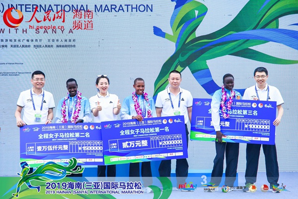 海南省旅游和文化廣電體育廳群體處處長(zhǎng)麥有旺、三亞市旅游和文化廣電體育局局長(zhǎng)陳震旻、匹克華南營(yíng)銷中心總經(jīng)理占冠世、中央電視臺(tái)少兒頻道主持人月亮姐姐為全程馬拉松女子前三名頒獎(jiǎng)