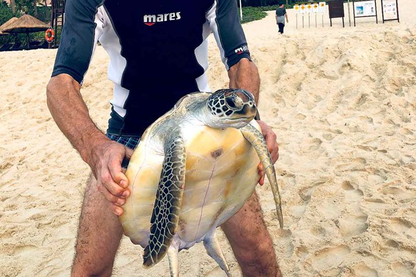 人民網(wǎng)訊 3月13日,三亞喜來登度假酒店迎來了一位特殊的“客人”——被《世界自然保護聯(lián)盟》(IUCN)列為瀕危物種的綠海龜。藍絲帶海洋保護協(xié)會的工作人員表示,綠海龜從外表看沒有明顯的外傷,將接受全面檢查后重回海洋。