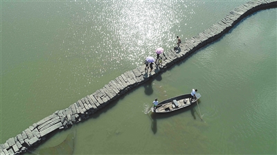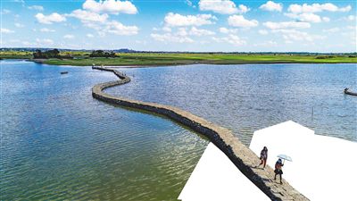 岸邊的蛇橋入口漂浮著幾艘木船,但這些船只似乎已經(jīng)很久未使用。吹著河風(fēng),慢悠悠地渡橋,潺潺的流水穿過(guò)石縫,讓人一時(shí)間有點(diǎn)兒恍惚。抬頭一看,遠(yuǎn)方是無(wú)垠的新舊溝田洋,這個(gè)季節(jié)正值海南種植早稻,一株株幼小的稻苗隨風(fēng)搖擺,連“株”成“片”,連“片”成“!保啦粍偈。而從高處看,橋梁中間共有四五個(gè)彎,整座橋如同一條長(zhǎng)蛇一路伸向?qū)Π丁?nbsp;