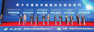 10月26日,第二屆中國(guó)·河南招才引智創(chuàng)新發(fā)展大會(huì)、中國(guó)·河南開(kāi)放創(chuàng)新暨跨國(guó)技術(shù)轉(zhuǎn)移大會(huì)在鄭州國(guó)際會(huì)展中心拉開(kāi)帷幕,開(kāi)幕式上舉行了重大關(guān)鍵技術(shù)揭榜攻關(guān)項(xiàng)目簽約儀式。本報(bào)記者聶冬晗攝