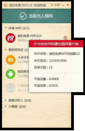 學(xué)生只要安裝運(yùn)行獵豹免費(fèi)WiFi2.0-校園神器,就能將電腦瞬間變成免費(fèi)WiFi,從而讓手機(jī)、PAD等無(wú)線設(shè)備免費(fèi)上網(wǎng)。而且,一個(gè)寢室的同學(xué)不用每人都辦理校園網(wǎng)套餐,可以共享同一校園網(wǎng)賬號(hào),從而幫助學(xué)生減輕經(jīng)濟(jì)負(fù)擔(dān)。