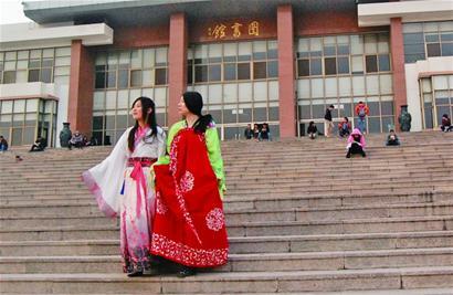 昨天下午,農(nóng)大圖書館前,大學(xué)生們?nèi)宄扇鹤谂_階上看書,中間兩個穿著漢服的女孩特別引人注目!敖(jīng)?吹剿齻冞@樣穿!薄白餍惆!”“在排練情景劇?”學(xué)生們對此似乎見怪不怪,但都說不出她們到底在干什么。說話間,兩名“漢服女孩”起身,一路聊一路走著,校園林蔭道、教室里、小河邊,兩人的出現(xiàn)成了一道獨特的風(fēng)景,每到一處立馬引來同學(xué)們的目光。