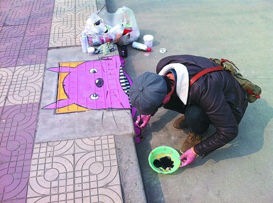 央廣網(wǎng)河南分網(wǎng)消息 據(jù)燕趙都市報(bào)報(bào)道:河北經(jīng)貿(mào)大學(xué)的校園里最近多了一道風(fēng)景:井蓋、下水道、臺(tái)階上,出現(xiàn)了小豬、大黃鴨、大臉貓、加菲貓小動(dòng)物,這些畫(huà)都出自河北經(jīng)貿(mào)大學(xué)大四學(xué)生熊航之手。熊航說(shuō),如果可以的話(huà),他想把這種井蓋藝術(shù)帶到城市里。 (記者 劉濤 李保健/攝)