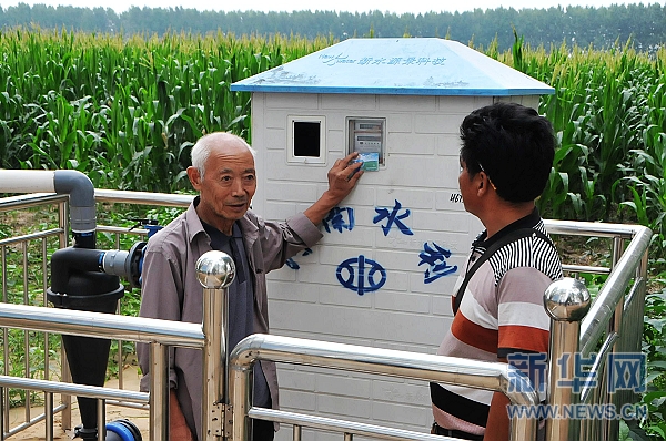 長葛市古橋鄉(xiāng)董天龍村村民高根樹(左)拿著“農(nóng)業(yè)用水智能卡”,在地頭智能化井房刷刷卡澆地(8月5日攝)。新華社記者 黃冠 攝