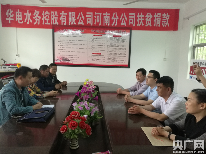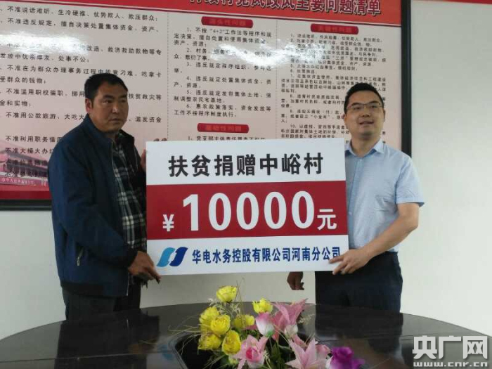 當(dāng)?shù)弥@里的村干部辦公等方面還存在很多困難,同行的華電水務(wù)控股有限公司河南分公司市場部總監(jiān)陳欣代表公司向中裕村現(xiàn)場捐贈(zèng)1萬元人民幣,助力脫貧攻堅(jiān)工作。