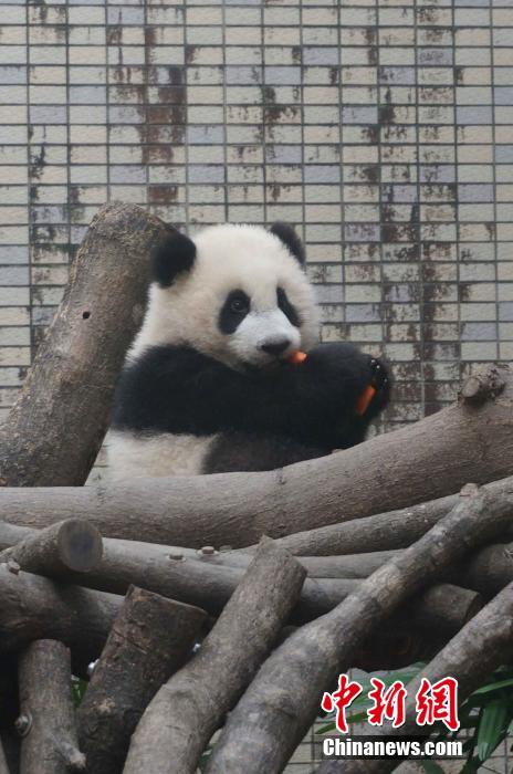 1月8日,大陸贈臺大熊貓寶寶“圓仔”見客第三天,臺北市立動物園發(fā)布一組有趣照片,再現(xiàn)“圓仔”跟媽媽的一場“和平紅蘿卜之役”。圖為“圓仔”叼著胡蘿卜往上爬。中新社發(fā) 臺北市立動物園 供圖