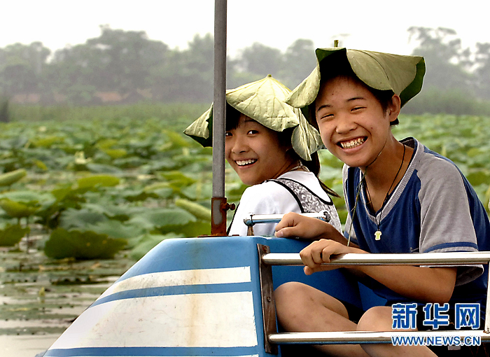 在河南省淮陽縣龍湖生態(tài)風(fēng)景區(qū),兩名小游客頭戴荷葉乘船賞景(2007年7月22日攝)。