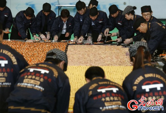 央廣網河南分網消息 據(jù)光明網報道:2014年1月8日,香港,工作人員在制作壽司拼圖。當日,香港一家壽司連鎖店為慶祝成立10周年,制作出一個由20647件壽司組成的拼圖,拼圖面積逾37平方米,打破“最大壽司拼圖”的吉尼斯紀錄。