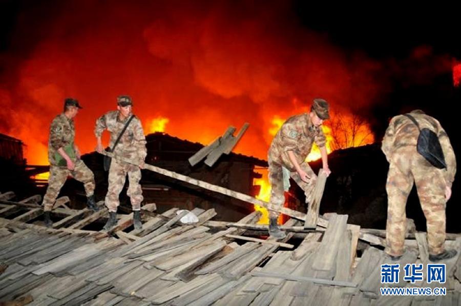 1月11日,部隊(duì)官兵在獨(dú)克宗古城火災(zāi)現(xiàn)場(chǎng)設(shè)置隔離帶,防止大火蔓延(手機(jī)拍攝)。