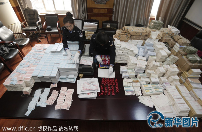 央廣網(wǎng)河南分網(wǎng)消息 據(jù)中國(guó)新聞網(wǎng)報(bào)道:2014年1月13日,武漢鐵路警方對(duì)外宣布,歷時(shí)2個(gè)月成功偵破全國(guó)最大系列制販假火車票案,連續(xù)搗毀3個(gè)制販假火車票窩點(diǎn),收繳高仿真假火車票百萬(wàn)余張(已制成全國(guó)各地假火車票282張);大量假國(guó)稅、地稅發(fā)票;裝有假火車票待發(fā)物流快件12件、已發(fā)快遞單74張;以及偽造公章56枚,打印機(jī)、電腦、裁紙機(jī)、打孔機(jī)、壓票機(jī)等一批作案工具。抓獲犯罪嫌疑人8人,起獲一大批制販假各種票據(jù)等工具。