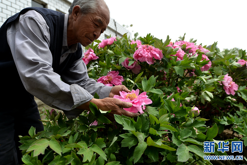 5月13日,許潤(rùn)枕老人向游人介紹牡丹花。