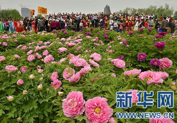 游客們在河南省洛陽市隋唐城遺址植物園的牡丹園內(nèi)賞花、游玩(2014年4月13日攝)。