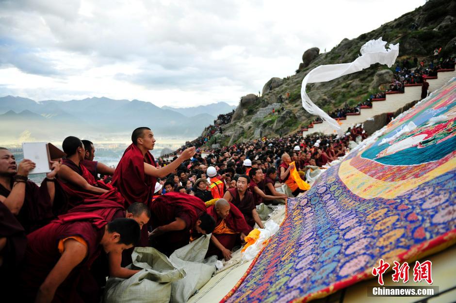 8月25日,拉薩哲蚌寺舉行展佛儀式,僧人們協(xié)力展開巨幅釋迦牟尼佛像。中新社發(fā) 唐朝楊 攝