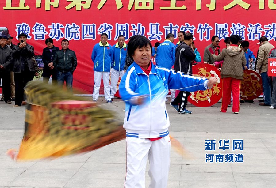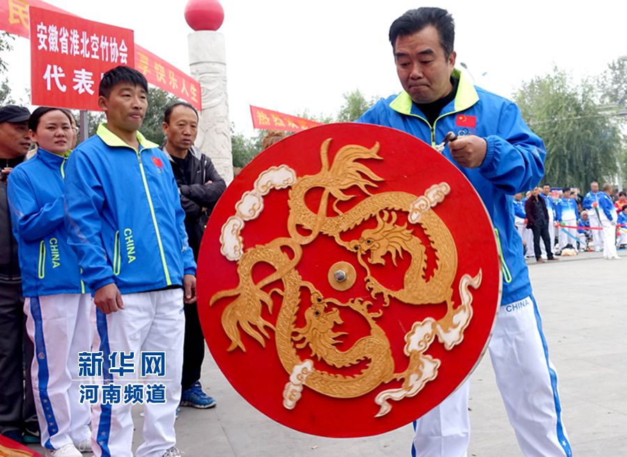 來自安徽淮北市空竹協(xié)會代表隊的空竹愛好者在表演抖特大空竹技藝。