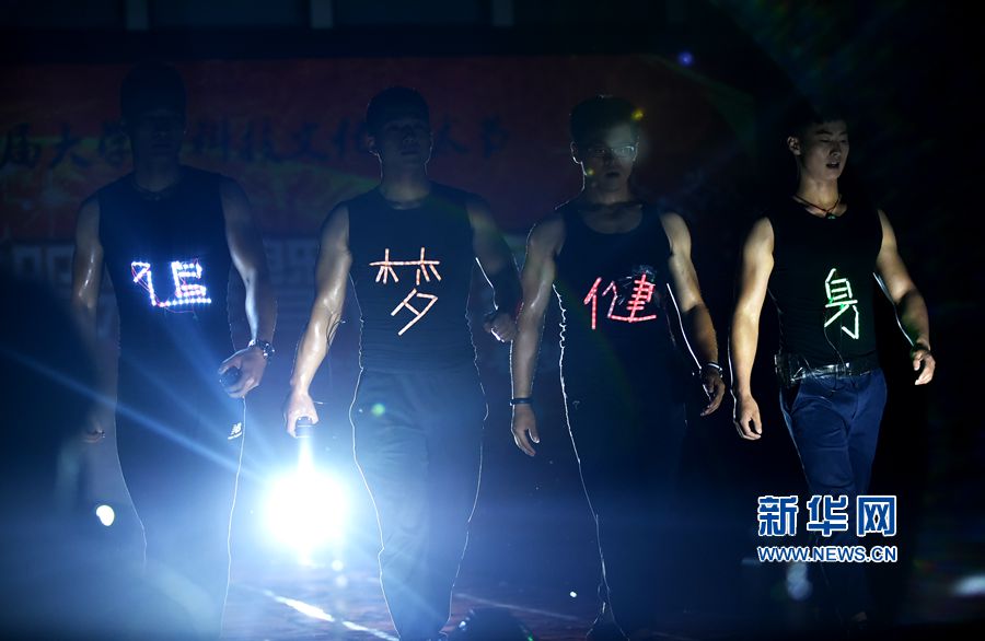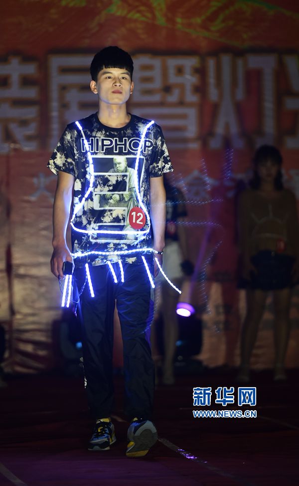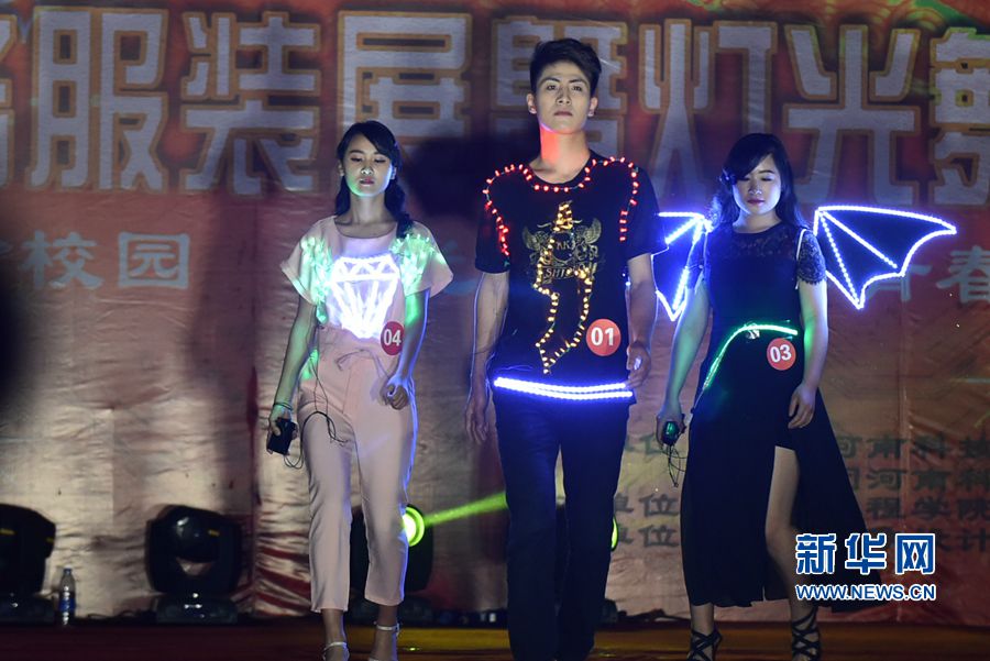 2016年5月21日晚,河南科技大學(xué)科技文化藝術(shù)節(jié)上,大學(xué)生自創(chuàng)的“電路服裝”T臺(tái)秀,創(chuàng)意十足。新華網(wǎng)發(fā)(黃政偉 攝)