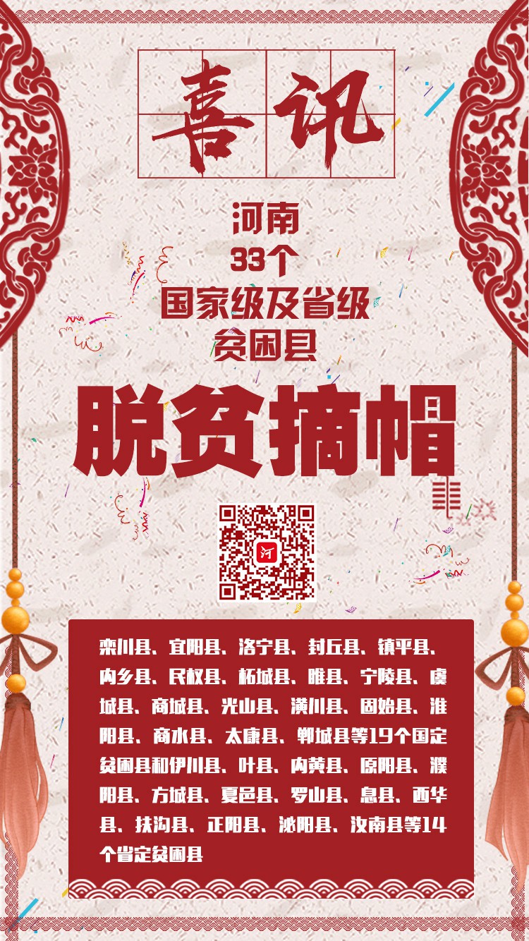 5月9日,我省又有33個(gè)縣“甩”掉貧困縣“帽子”。這是繼蘭考、滑縣、舞陽(yáng)、新縣、沈丘、新蔡等6縣退出貧困縣序列后,我省脫貧攻堅(jiān)的又一重要成就。