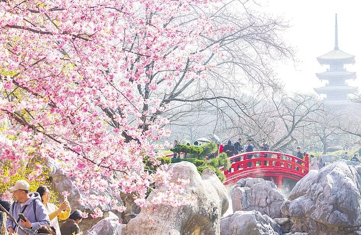 3月11日,武漢東湖櫻花園早櫻綻放,粉紅花瓣綴滿枝頭,吸引來自香港、廣州、湖南等地游客紛至沓來,共賞春日美景,盡享浪漫春光。