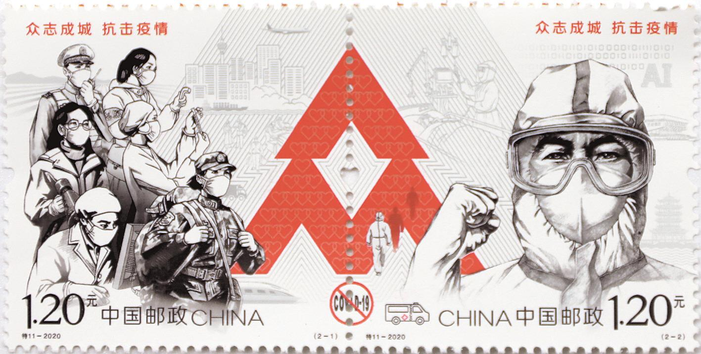 另外,十一屆三中全會召開、奧林匹克運動會、中國夢——國家富強系列郵票等重大事件、題材,濃縮在一枚枚郵票中,讓人眼前一亮。其中,中國郵政于2020年5月11日特別發(fā)行的《眾志成城 抗擊疫情》郵票1套2枚,采用連票形式,郵票圖案中“眾”字將兩枚郵票緊密連接,寓意著面對突發(fā)重大公共衛(wèi)生事件,在黨中央堅強領(lǐng)導下,全國上下凝聚起眾志成城、抗擊疫情的強大力量。
