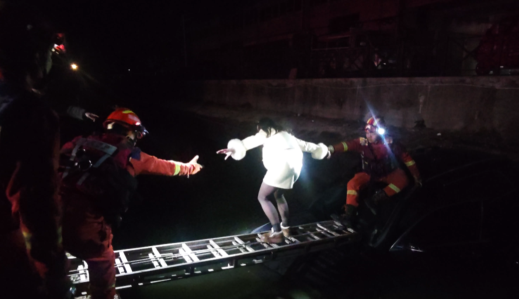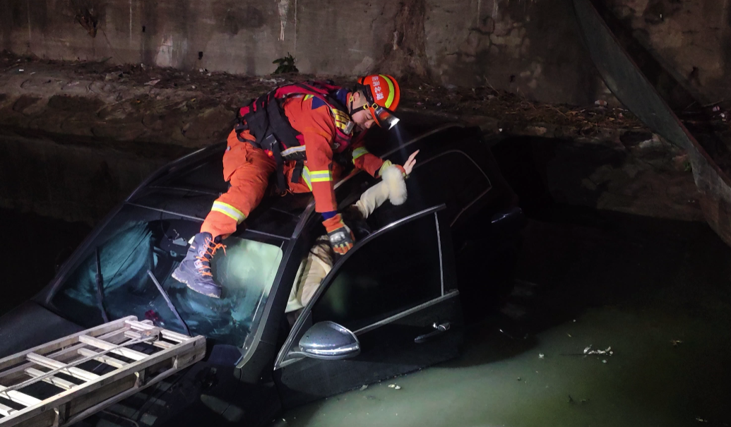 凌晨4時(shí)25分,消防員抵達(dá)現(xiàn)場(chǎng),夜色中,一輛黑色SUV汽車車身幾乎一半沒入水中,僅剩車頂部分露出水面,一名女性駕駛員被困駕駛室,車體正緩慢下沉,情況危急。