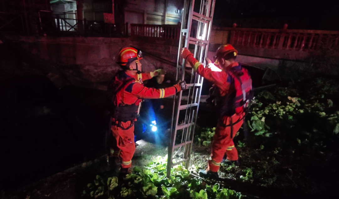 “不要慌,我們馬上救你出來!”消防員通過喊話,安撫被困人員情緒,同時(shí)快速評(píng)估現(xiàn)場(chǎng),現(xiàn)場(chǎng)水深約2.5米,救援人員決定采取最穩(wěn)妥方案,利用6米拉梯架設(shè)救援通道,消防員將拉梯從岸邊延伸至車體,形成一條生命通道。