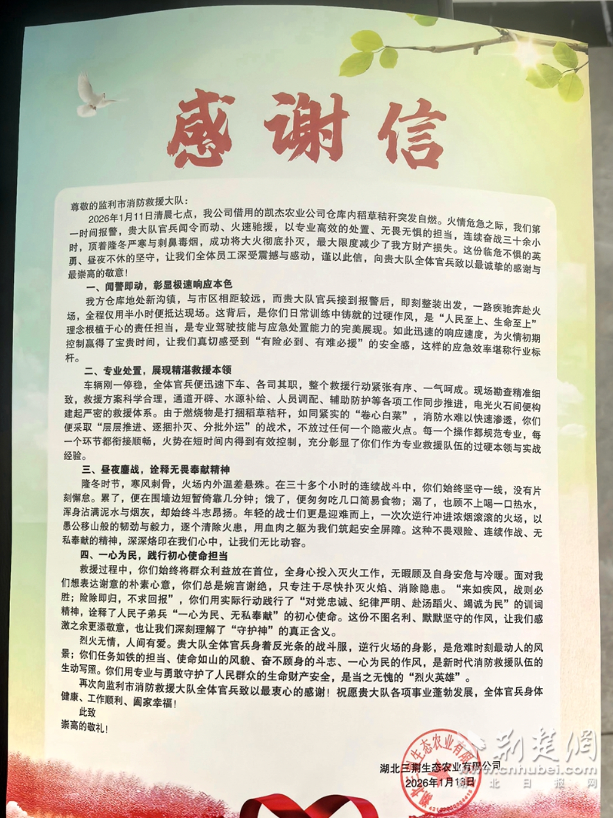 近日,荊州監(jiān)利市消防救援大隊(duì)收到群眾贈(zèng)送的一面印有“秸稈自燃釀險(xiǎn)情 官兵鏖戰(zhàn)保平安”的錦旗,借以表達(dá)對大隊(duì)全體指戰(zhàn)員的衷心感謝。