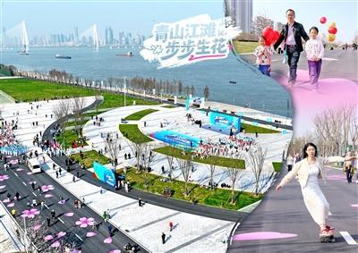 3月14日,武漢青山江灘二期櫻花、海棠、薔薇等花卉競相開放,長江水景與岸邊繁花相映成趣,吸引眾多市民游客前來踏春游玩。休閑步道路面上繪制了粉色櫻花圖案,與枝頭的櫻花呼應,不少市民沿著花徑漫步,有人踩著滑板穿梭其間,有人舉著手機定格江景與繁花,還有家長牽著孩子在花瓣圖案上蹦跳前行。江風里飄著淡淡花香,彩色風箏在晴空里搖曳,處處都是松弛的生活氣息。