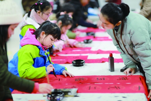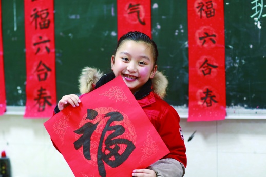 衡陽市青少年宮,小朋友在展示、書寫“!弊趾痛郝(lián)。當(dāng)天,該青少年宮開展寫春聯(lián)、送祝;顒,讓青少年在參與中增強對春節(jié)的認知,傳承中華優(yōu)秀傳統(tǒng)文化。