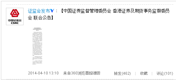 央廣網(wǎng)財經(jīng)北京4月10日消息(記者丁玲娜)據(jù)經(jīng)濟之聲報道,證監(jiān)會、香港證券及期貨事務(wù)監(jiān)察委員會剛剛聯(lián)合發(fā)布公告,決定原則批準上海證券交易所、香港聯(lián)合交易所有限公司、中國證券登記結(jié)算有限責任公司、香港中央結(jié)算有限公司開展滬港股票市場交易互聯(lián)互通機制試點,簡稱“滬港通”。