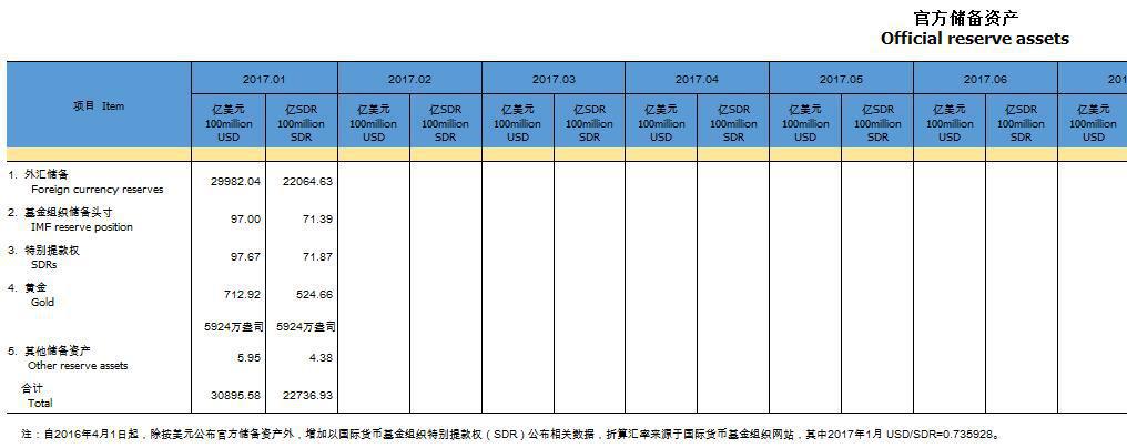 央廣網(wǎng)2月7日消息 央行公布的2017年1月官方儲(chǔ)備資產(chǎn)數(shù)據(jù)顯示,1月份中國(guó)外匯儲(chǔ)備為29982.04億美元,較2016年12月末的30105.17億美元,減少123.13億美元。