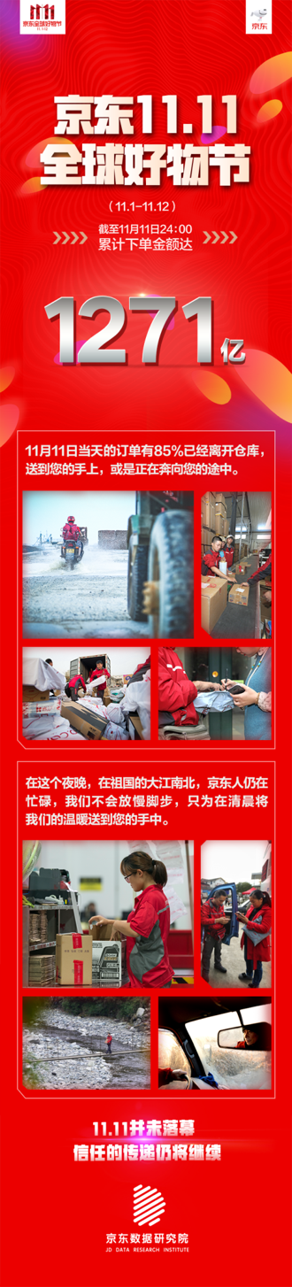 11月11日24時(shí),京東11.11全球好物節(jié)(11月1日-12日)迎來(lái)又一個(gè)高潮,截至11日24時(shí)京東商城累計(jì)下單金額已超過1271億元。