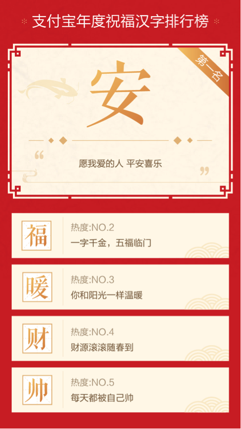 “一字千金”是支付寶今年推出的一個(gè)新功能,網(wǎng)友可以選擇自己最想送給好友的一個(gè)字相贈(zèng)。數(shù)據(jù)顯示:平均每10個(gè)參與者中,就有一個(gè)人把”安“字送給親朋好友。排名第2至第5的祝福則分別為:福、暖、財(cái)和帥。