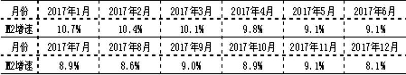 注2:2018年1月,人民銀行完善貨幣供應(yīng)量中貨幣市場(chǎng)基金部分的統(tǒng)計(jì)方法,用非存款機(jī)構(gòu)部門持有的貨幣市場(chǎng)基金取代貨幣市場(chǎng)基金存款(含存單)。完善后,2017年各月末M2增速如下: