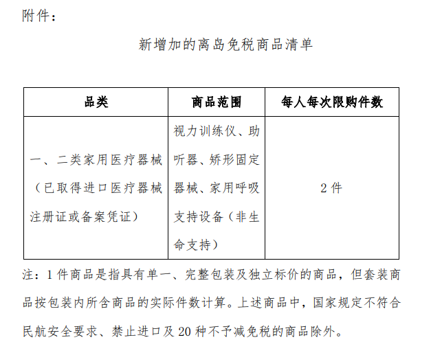 二、增加部分家用醫(yī)療器械商品,在離島免稅商品清單中增加視力訓(xùn)練儀、助聽(tīng)器、矯形固定器械、家用呼吸支持設(shè)備(非生命支持),每人每次限購(gòu)2件(詳見(jiàn)附件)。
