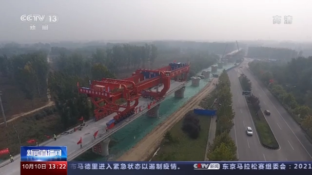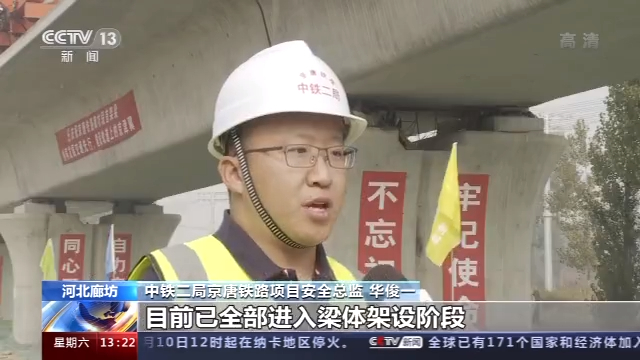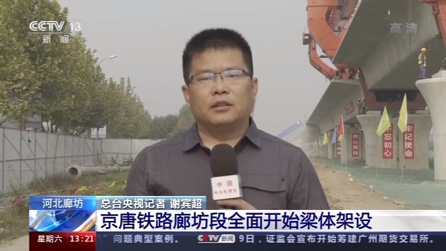 總臺(tái)央視記者 謝賓超:這里是河北廊坊大廠回族自治縣京唐鐵路的施工現(xiàn)場(chǎng),隨著我身后這座790噸的無(wú)砟箱梁的緩緩降落,標(biāo)志著京唐鐵路的廊坊的全面進(jìn)入了橋梁架設(shè)的施工階段。