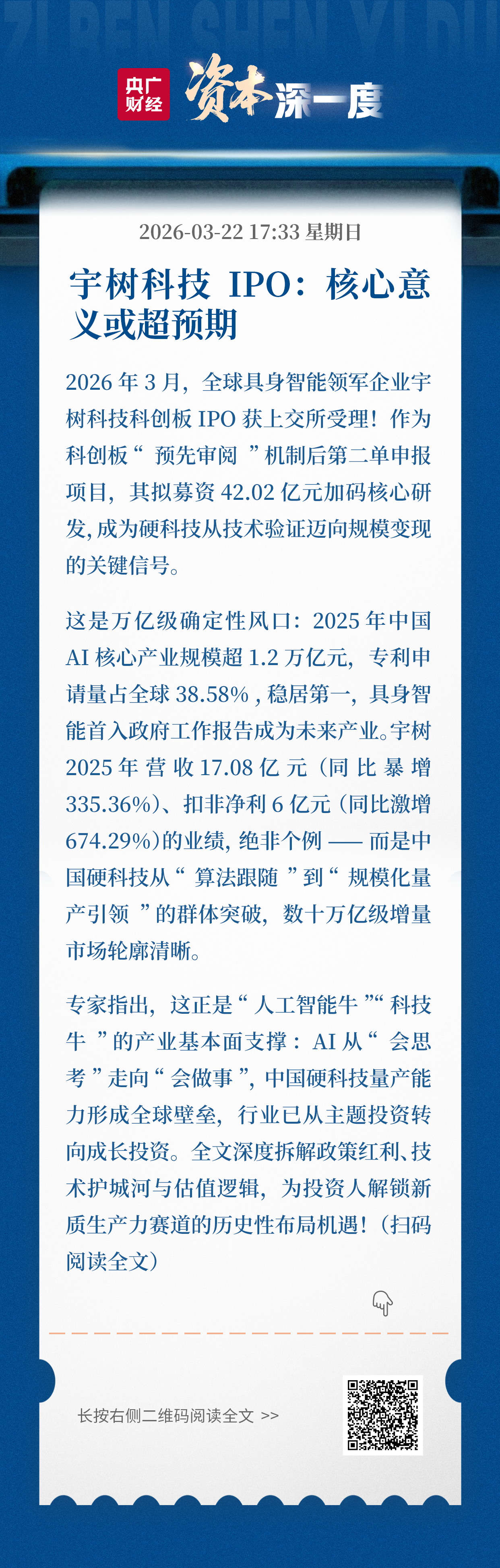 央廣網(wǎng)北京3月22日消息(記者 傅天明)全球具身智能領軍企業(yè)宇樹科技股份有限公司(下稱“宇樹科技”)科創(chuàng)板IPO申請日前獲上交所正式受理。標志著這家企業(yè)正式?jīng)_刺資本市場。作為科創(chuàng)板“預先審閱”機制后的第二單申報企業(yè),宇樹科技擬公開發(fā)行新股不低于4044.64萬股(占發(fā)行后總股本比例不低于10%),計劃募資42.02億元,聚焦智能機器人模型研發(fā)、本體研發(fā)、新產(chǎn)品開發(fā)及制造基地建設四大核心方向。專家表示,此次IPO不僅是企業(yè)自身的資本進階,更折射出人工智能產(chǎn)業(yè)從概念落地實體經(jīng)濟、具身智能技術突破與“科技牛”行情共振的行業(yè)趨勢,其對硬科技產(chǎn)業(yè)升級的標桿意義或遠超市場想象。
