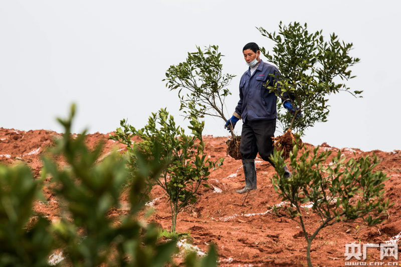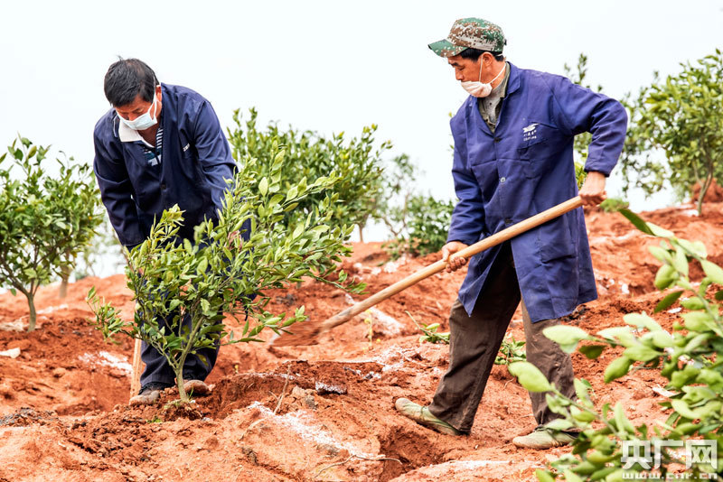 江西省吉安市新干縣金川鎮(zhèn)臘月紅基地上,貧困戶正在移栽柑桔苗
