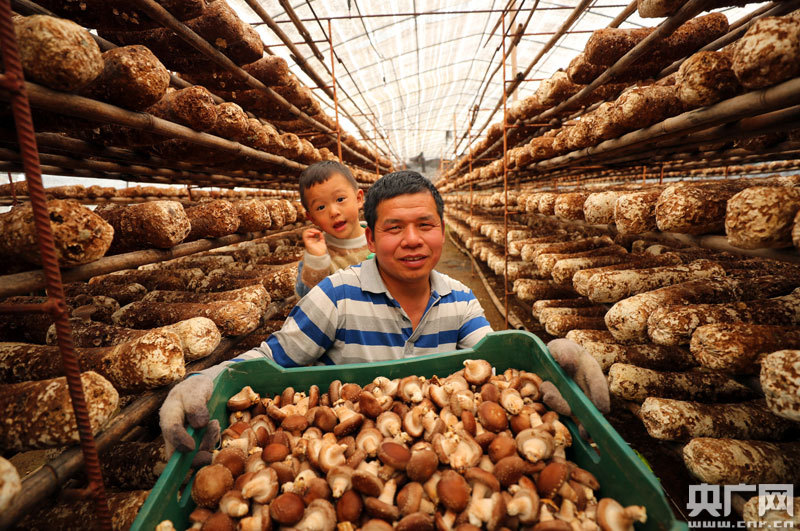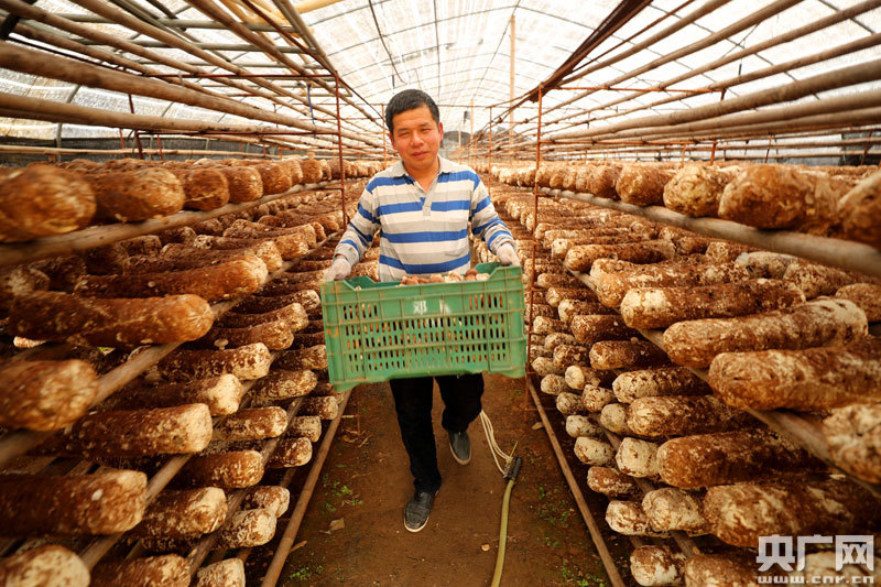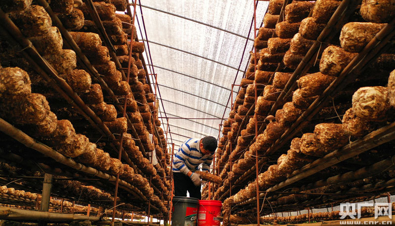 農(nóng)民正在采摘扶貧香菇