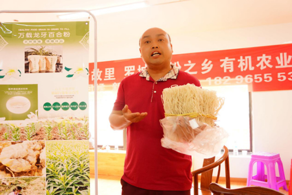 來(lái)自江西萬(wàn)載縣的農(nóng)場(chǎng)主甘奉孝向記者介紹羅城手工米粉、有機(jī)百合粉等特色農(nóng)產(chǎn)品。