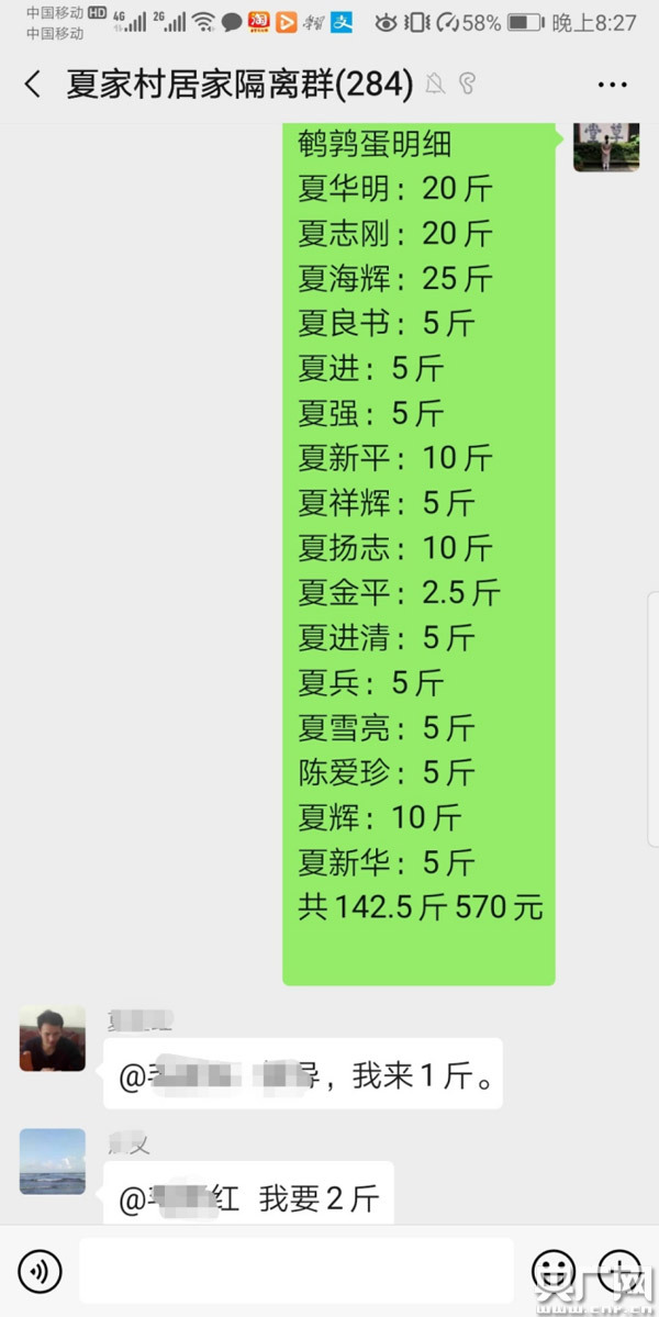 頓時,同田鄉(xiāng)的婦聯(lián)工作群、機關(guān)干部工作群、疫情信息閉環(huán)工作群等近10個微信群里熱鬧了起來:“可以送貨上門嗎?行的話來20斤!薄拔乙褰铩、“我食堂里要60斤”....隨著一條條信息推出,下單的也接連不斷,聽說是貧困戶家的鵪鶉蛋積壓,不少干部在自己的朋友圈也轉(zhuǎn)發(fā)起來。夏家村的居家隔離群更是接起了長龍,短短一個小時,就有20多戶村民訂購了近150斤鵪鶉蛋。在大家的幫助下,通過微信群、朋友圈以及村民自發(fā)訂購等方式,僅15號一天就下單售出鵪鶉蛋500多斤,這下可把吳華樂壞了,皺著的眉頭也打開了。他說:這次多虧了扶貧干部,解了他的燃眉之急,他堅信,有黨和政府的關(guān)心和依靠,他一定能發(fā)家致富。吳華還表示,疫情發(fā)生后,鎮(zhèn) 村干部和志愿者都忙碌防疫一線,他也要申請去當志愿者蛋,為防控疫情盡一力。