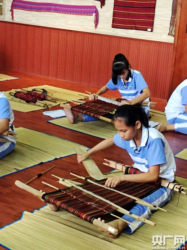 海南陵水思源實(shí)驗(yàn)學(xué)校學(xué)生正在編織黎錦 記者 安紅麗/攝