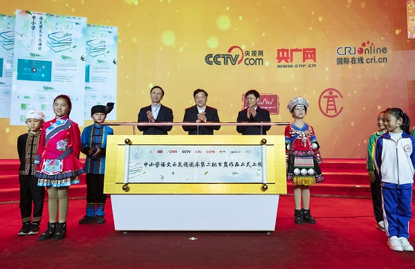 2018年12月23日下午,中央廣播電視總臺(tái)、教育部、國(guó)家語(yǔ)委聯(lián)合舉辦“中小學(xué)語(yǔ)文示范誦讀庫(kù)”第二季作品發(fā)布會(huì)。中宣部副部長(zhǎng)、中央廣播電視總臺(tái)臺(tái)長(zhǎng)慎海雄,教育部副部長(zhǎng)、國(guó)家語(yǔ)委主任杜占元,中央廣播電視總臺(tái)副臺(tái)長(zhǎng)閻曉明出席發(fā)布會(huì),并共同見證第二批100篇音頻教材正式上線發(fā)布。 新華社記者沈伯韓 攝