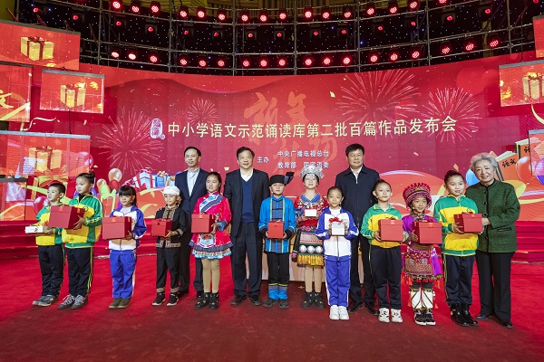 2018年12月23日下午,中央廣播電視總臺(tái)、教育部、國(guó)家語(yǔ)委聯(lián)合舉辦“中小學(xué)語(yǔ)文示范誦讀庫(kù)”第二季作品發(fā)布會(huì)。中宣部副部長(zhǎng)、中央廣播電視總臺(tái)臺(tái)長(zhǎng)慎海雄,教育部副部長(zhǎng)、國(guó)家語(yǔ)委主任杜占元,中央廣播電視總臺(tái)副臺(tái)長(zhǎng)閻曉明出席發(fā)布會(huì),并共同見證第二批100篇音頻教材正式上線發(fā)布。新華社記者沈伯韓 攝