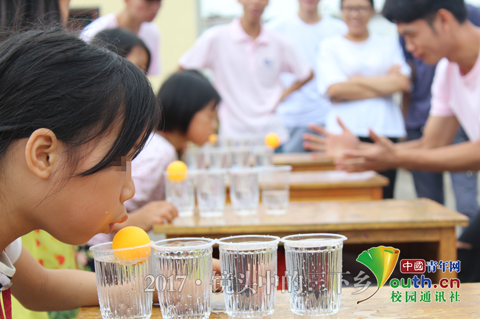 志愿者和孩子們開心的玩著吹兵乓球的游戲,志愿者在一旁幫孩子們加油鼓勁。 中國青年網(wǎng)通訊員 韋康成 攝