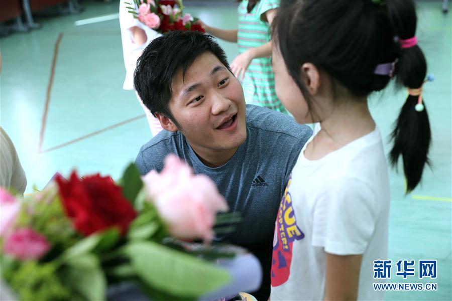 剛剛從幼兒園畢業(yè)的孩子們回來看望張鳴川(右二)和他的同事們(9月8日攝)。新華社記者 張玉薇 攝 -
