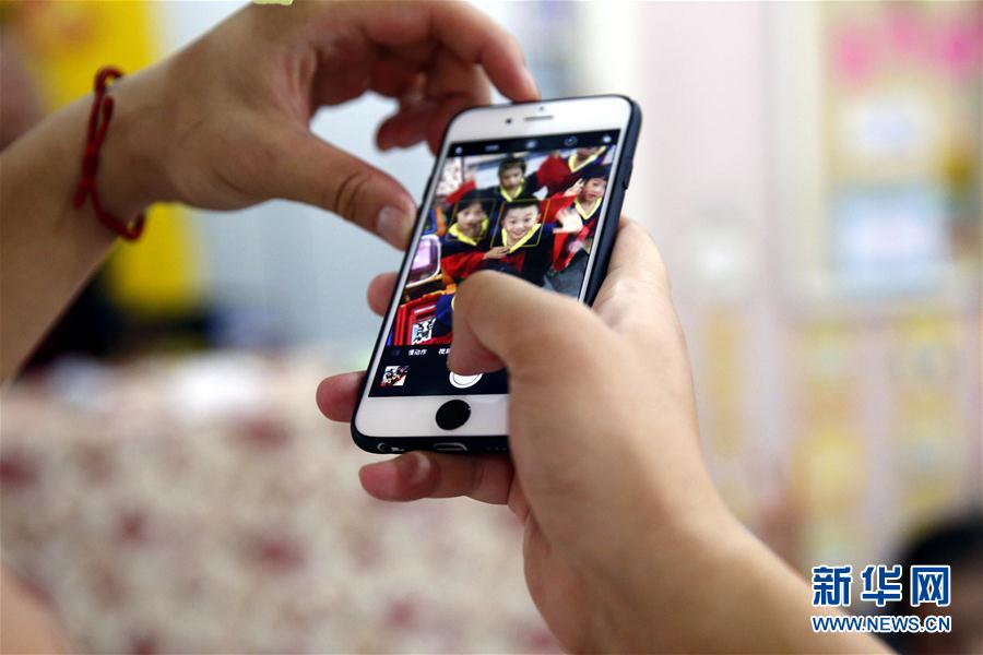張鳴川用手機拍攝穿著畢業(yè)服的孩子們(6月30日攝)。新華社記者 張玉薇 攝 -